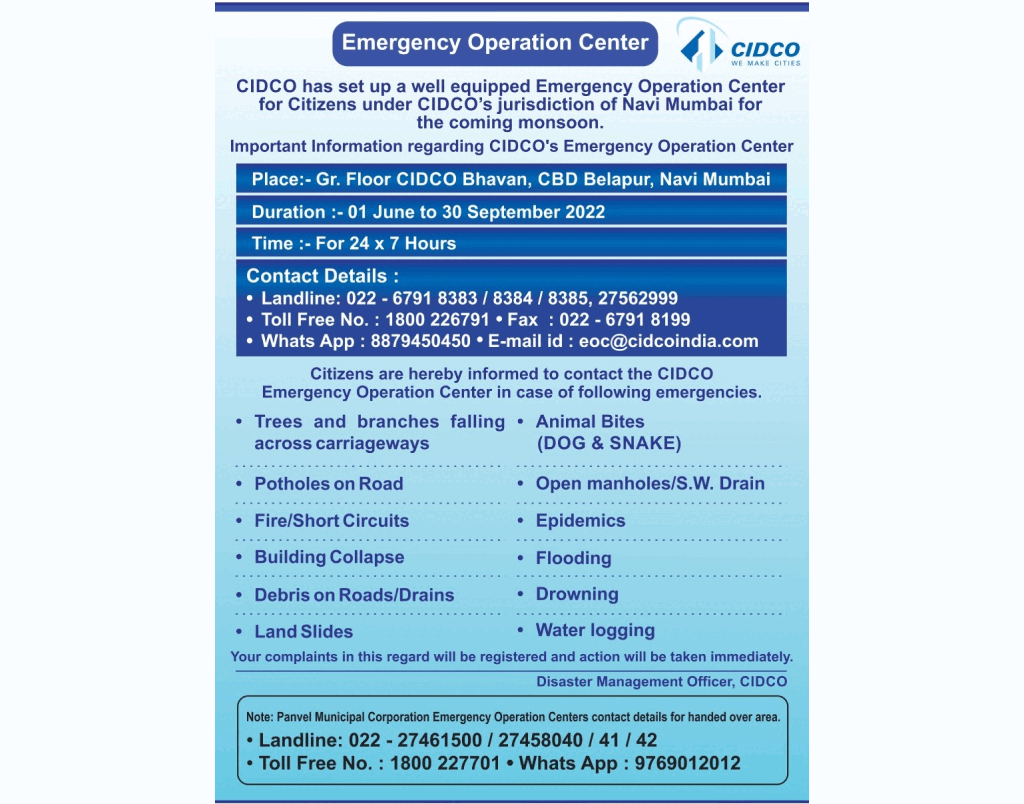 | рдЕрдзрд┐рдХреНрд╖рдХ рдЕрднрд┐рдпрдВрддрд╛ (рдЦрд╛рд░рдШрд░ рдЖрдгрд┐ рд╡рд╛рд╢реА) рджреВрд░рдзреНрд╡рдиреА рдХреНрд░рдорд╛рдВрдХ :- ремренрепрезреорелрезрео рдИ-рдореЗрд▓ рдЖрдпрдбреА :- se.vashi@cidcoindia.com | |||||